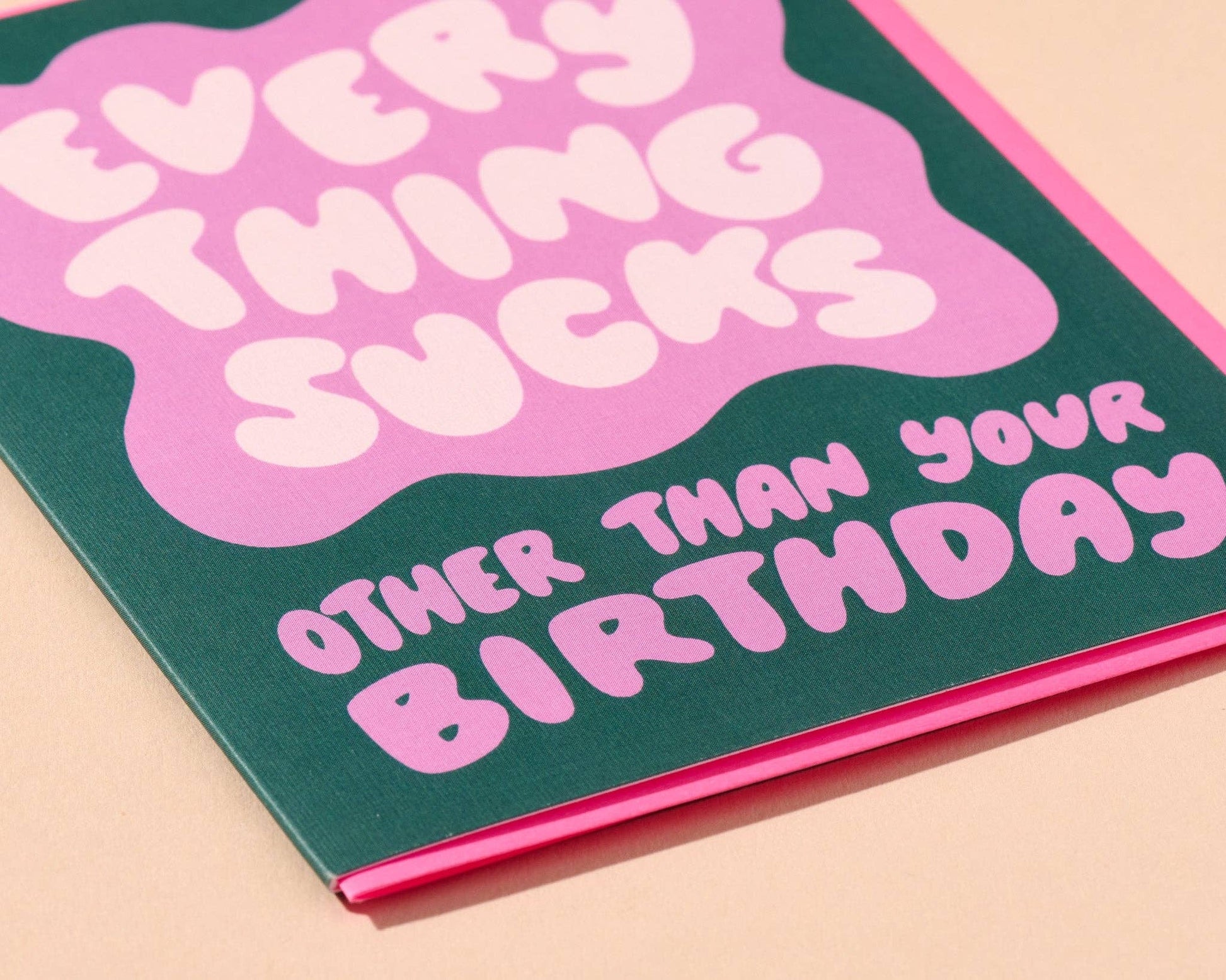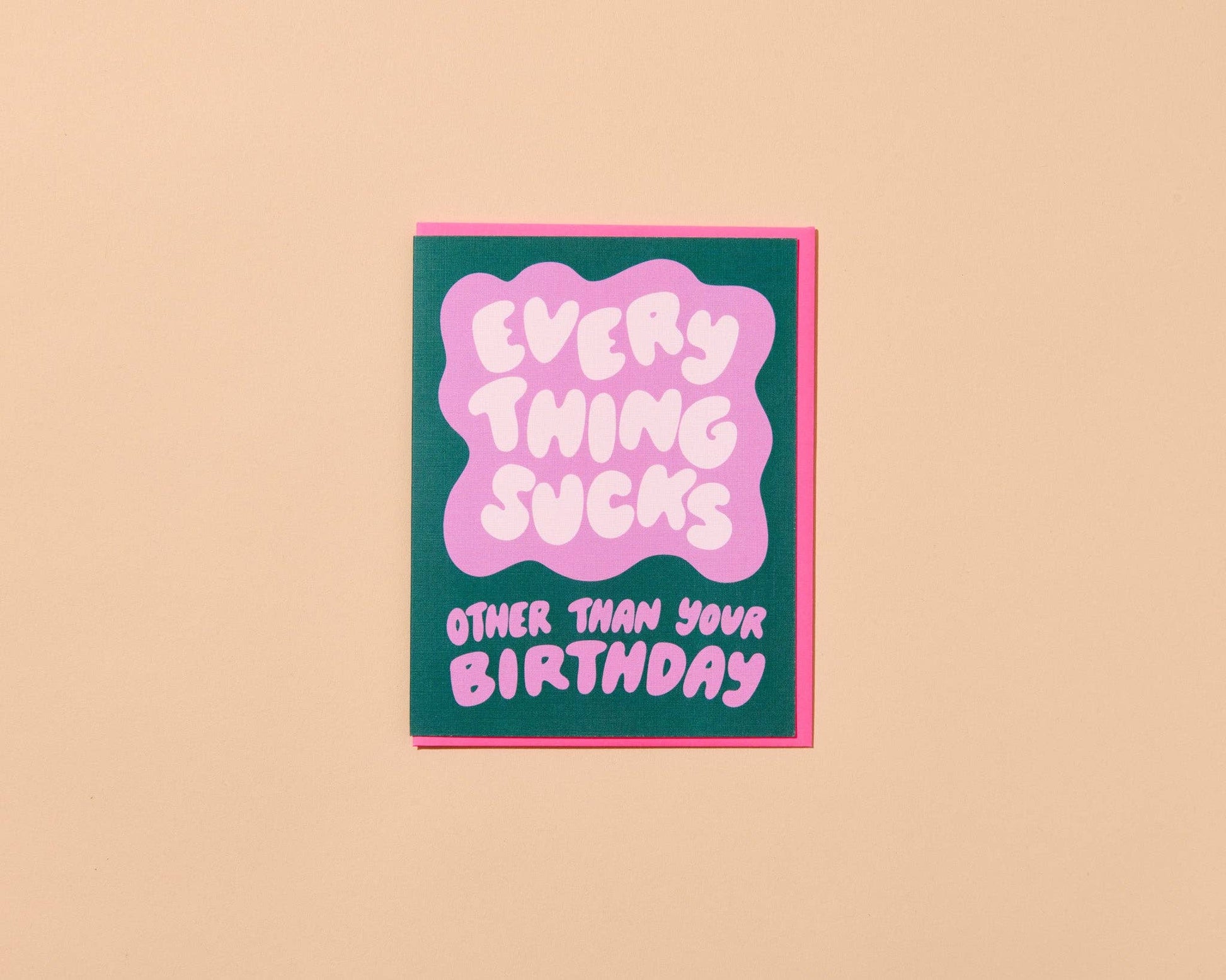 When everything feels like a mess, this card is here to remind them their birthday is still worth celebrating. • Card reads, “Everything Sucks Other Than your Birthday” • Digitally printed onto luxe, bright-white linen textured paper • Folded card measures A2 (4.25′′ x 5.5′′) and comes with a coordinating envelope • Made in the US • Words and illustrations by Kiwi Schloffel. And Here We Are -