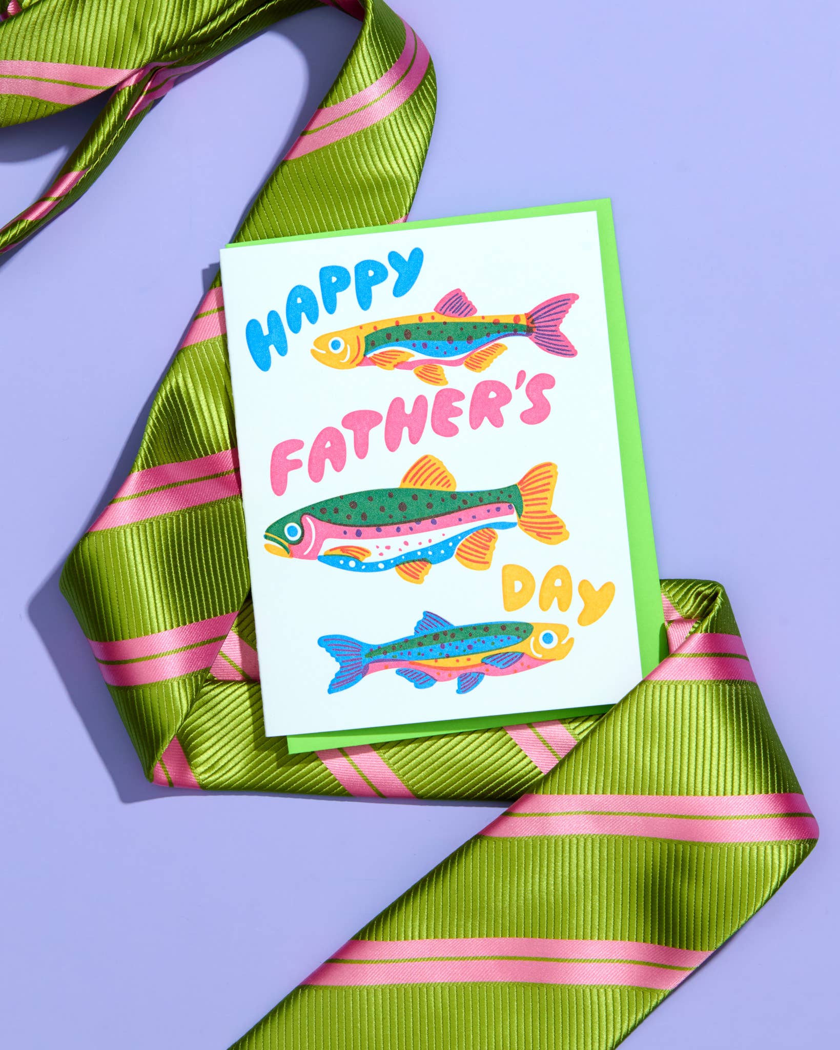 Letterpress Father’s Day greeting card reading “Happy Father’s Day,” with fun colorful trout illustration for the outdoorsy dad. Hand printed in the USA.