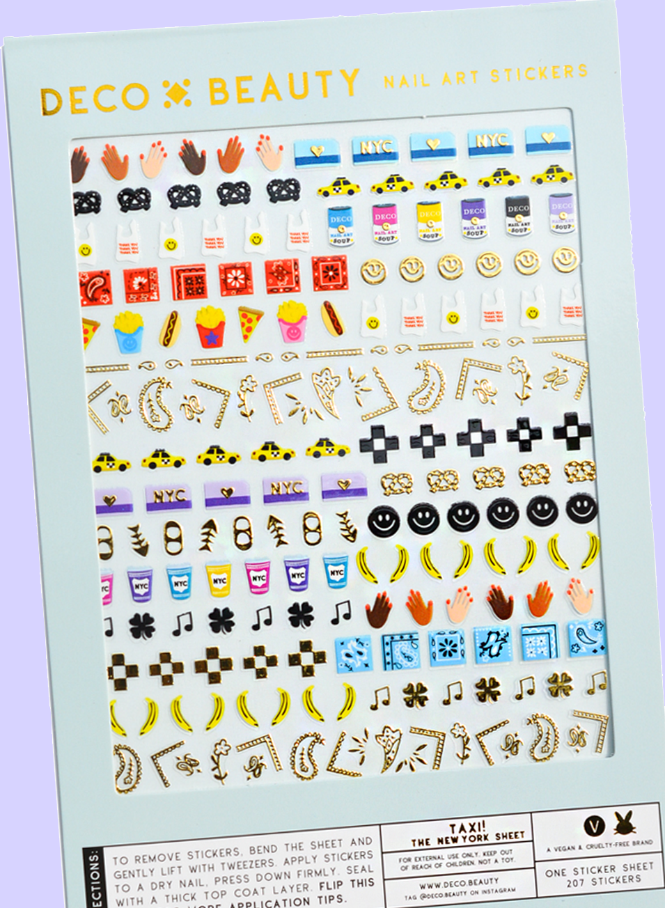 For best results, use a thick top coat (Deco's Gel Effect Plumping Top Coat was specifically designed in mind for this job) to seal the sticker on your nail. You may need to put an extra coat overtop of gold metallic stickers.