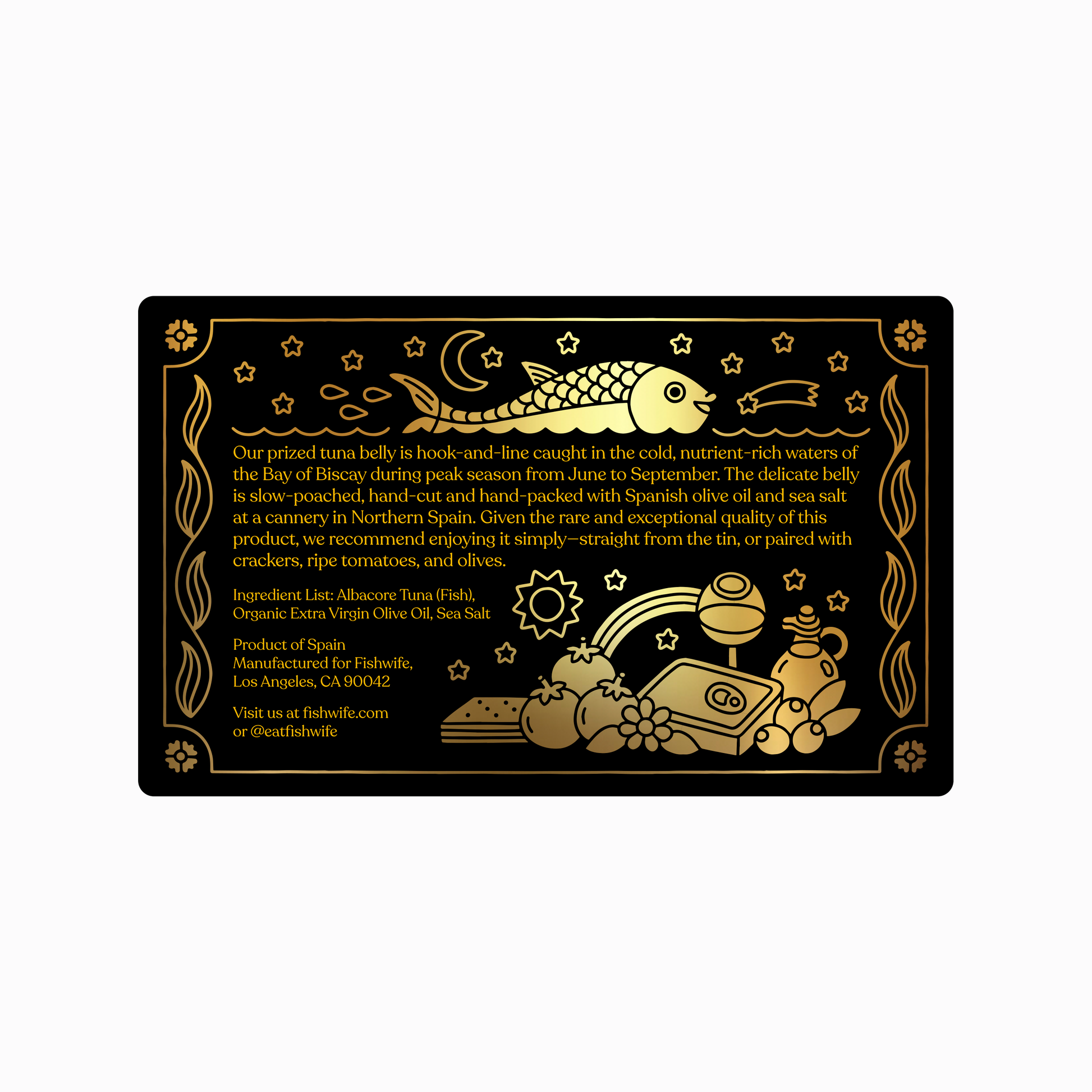 Meet the most luxurious tin we have ever launched. Tuna Belly (also known as Ventresca) is the tender, buttery belly cut of albacore tuna, the most prized part of the fish and what we call the wagyu of the sea. Each tin takes 37 minutes to make, resulting in a silky, melt-in-your-mouth bite that feels indulgent and unforgettable. Only about 6 percent of the fish is belly, making this tin a rare treasure meant to be savored slowly and shared with love.