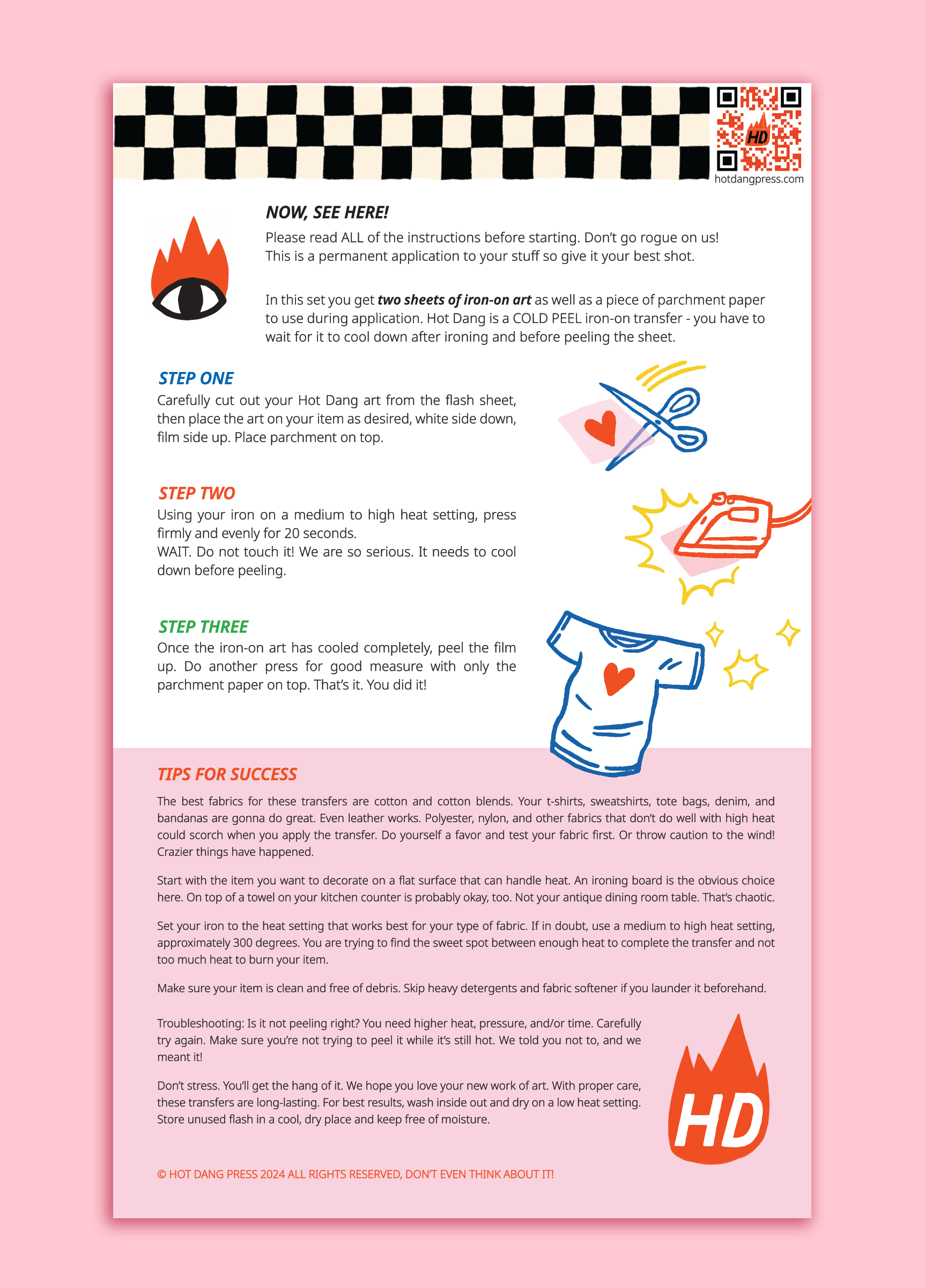 Iron-on art to customize and enhance your apparel, totes, hats, tea towels, bandanas, handkerchiefs, leather goods, and other treasures. Each set includes two sheets of the displayed illustrations, heat protective parchment paper for application, and easy peasy instructions. You bring the heat! All you need is an iron. Sheets are 5.25x7.5 inches.