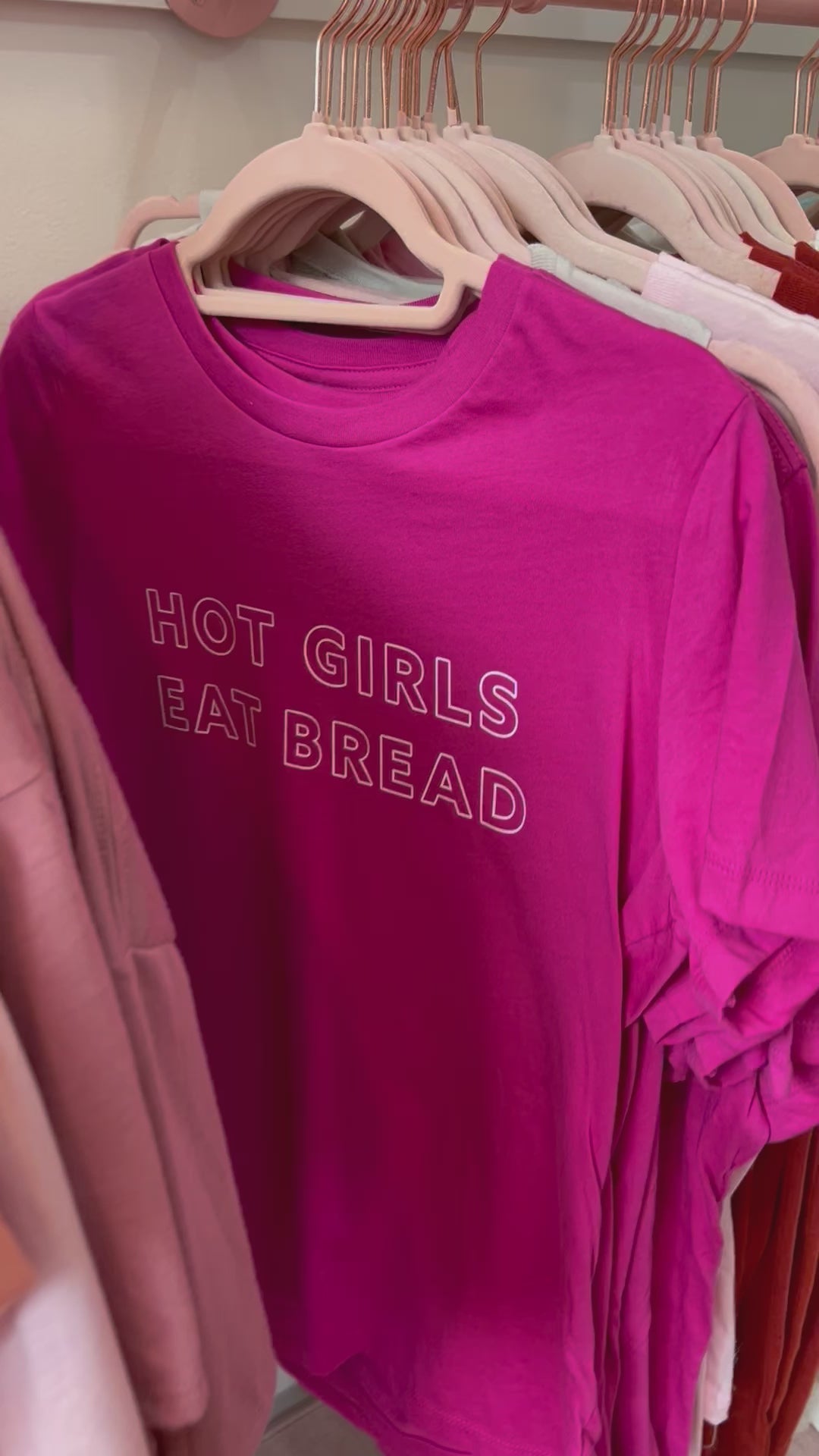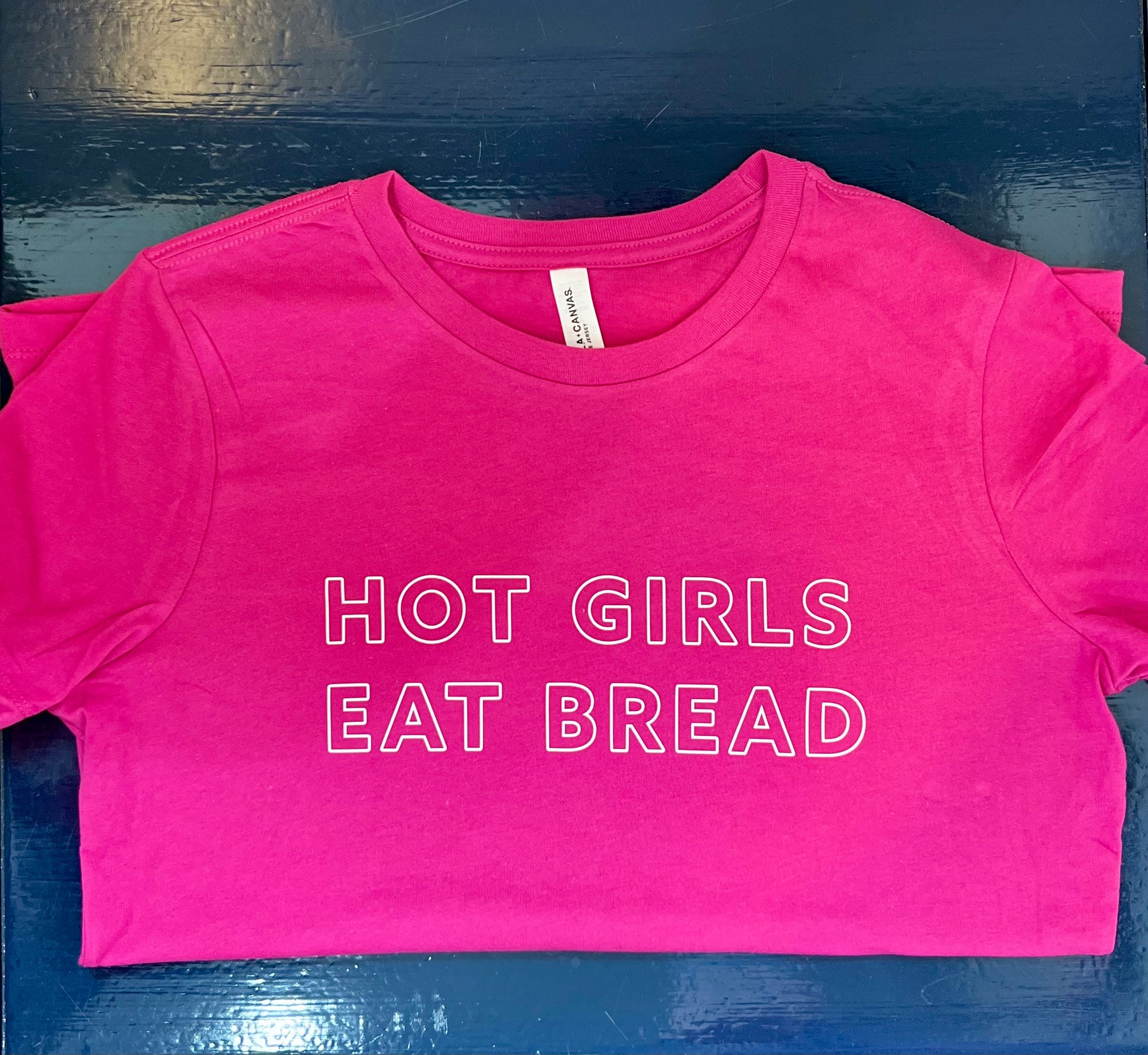Take down diet culture and proclaim your love of carbs with the Hot Girls Eat Bread t-shirt. This dark grey tee with pink graphic comes in women's sizes and is true to size. 10% of profits go to World Central Kitchen.