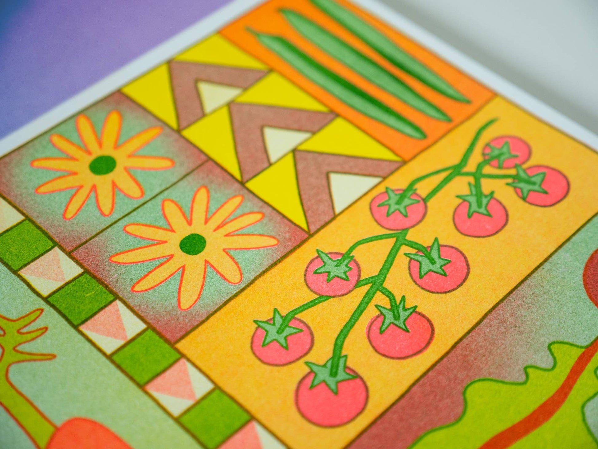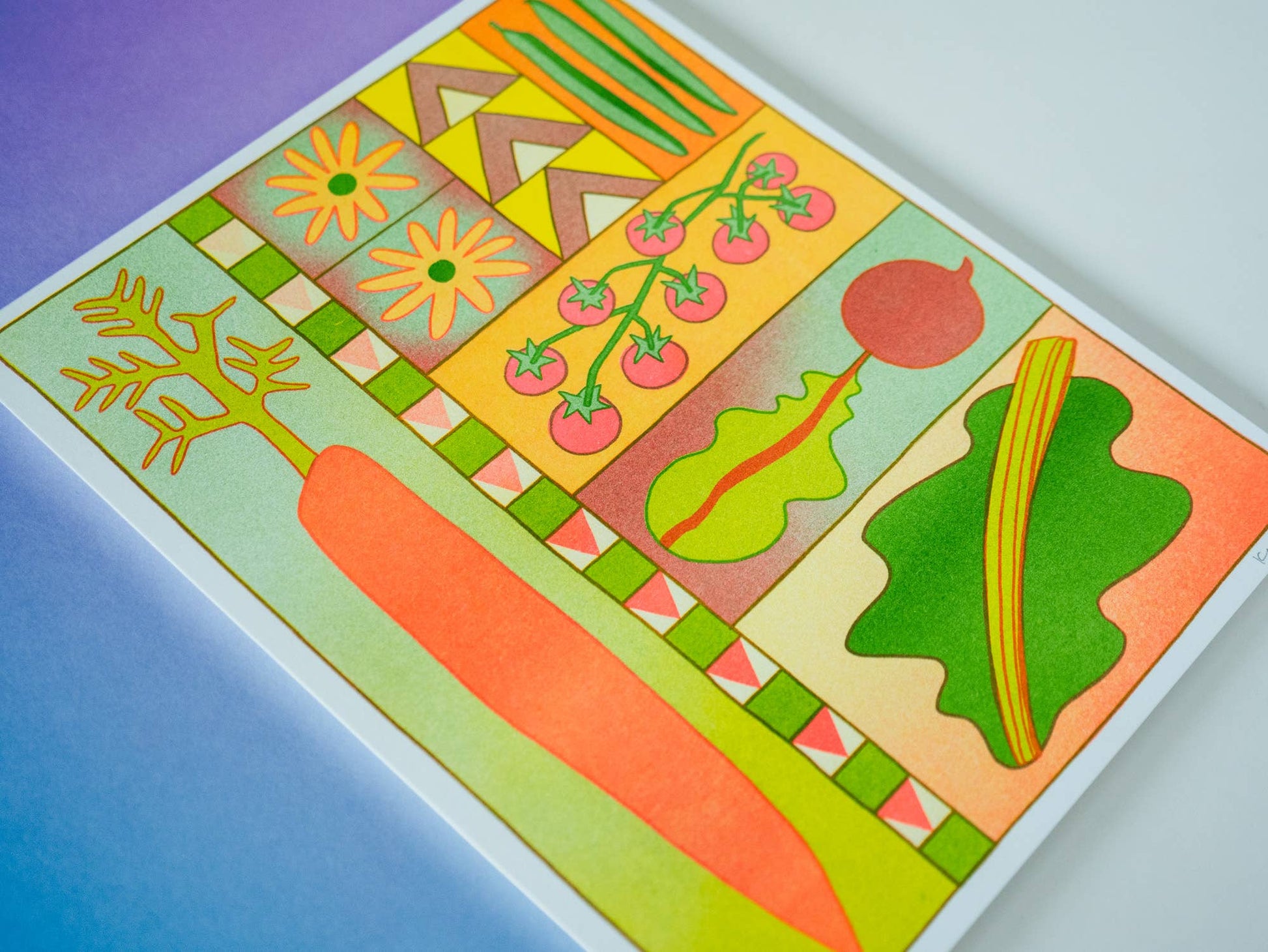 - 8"x10" risograph art print - Risograph print of an original illustration of garden vegetables printed with vibrant vegetable-based fluorescent inks - Packaged in cello sleeve with a cardboard backer. made by Katie Blanchard Art + Works