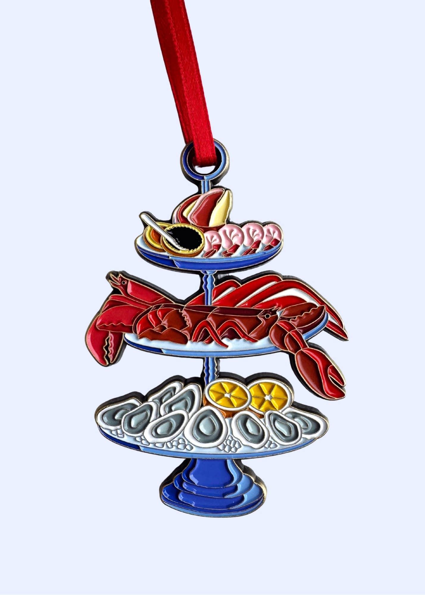 Enamel and metal ornament featuring a seafood tower with lobster, oysters, crab, shrimp, and caviar. Great for unique holiday gift for foodies or for cute room decor all year round.