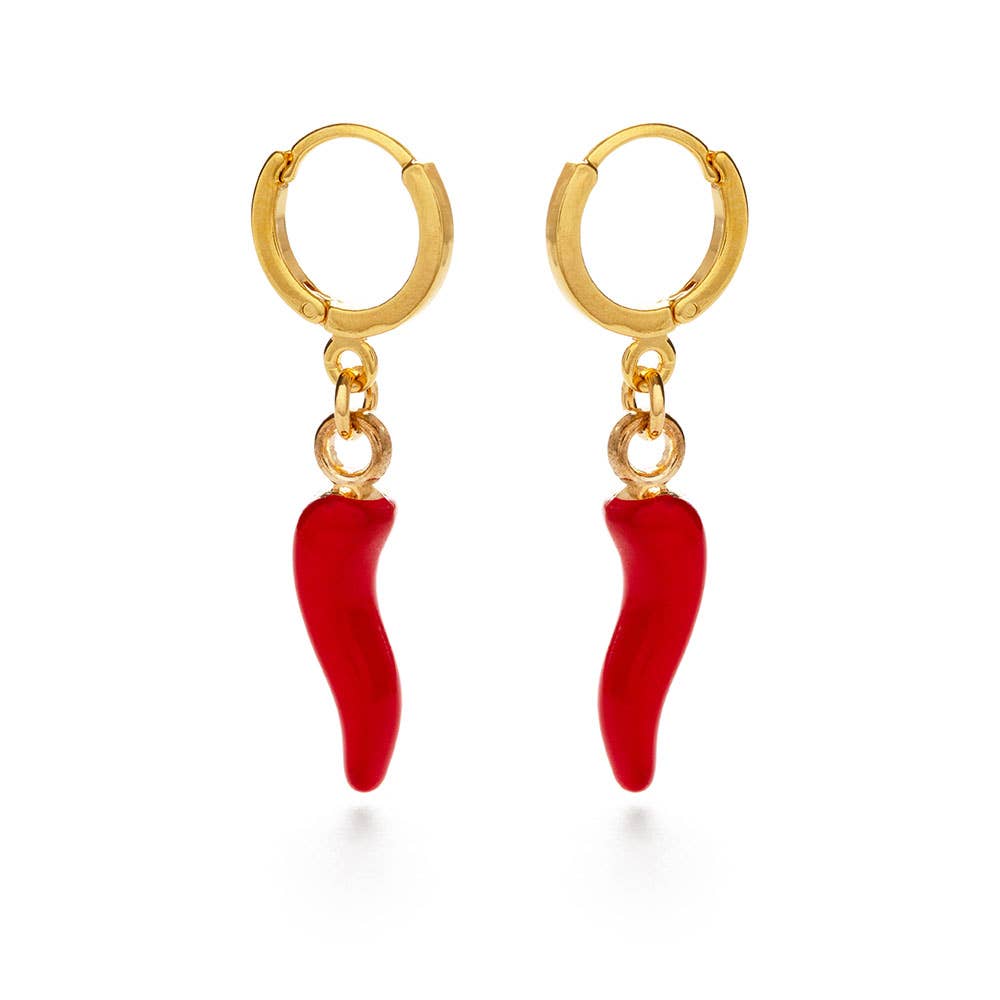 The Italian cornicello is known as the horn that brings good luck. It is worn for protection and fertility. The cornicello measures .5" in length. The 14mm huggie hoops are made of 14k gold plated brass. Lead and nickel free.