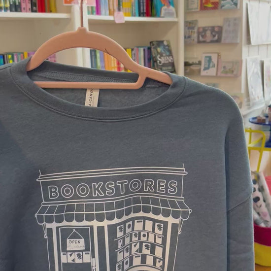 The Bookstores Not Billionaires Crewneck is a vintage inspired color and design, that celebrates independent bookstores and all that they offer our communities. It come in slate blue color with white graphic and it comes in unisex sizes. This style runs true to size.