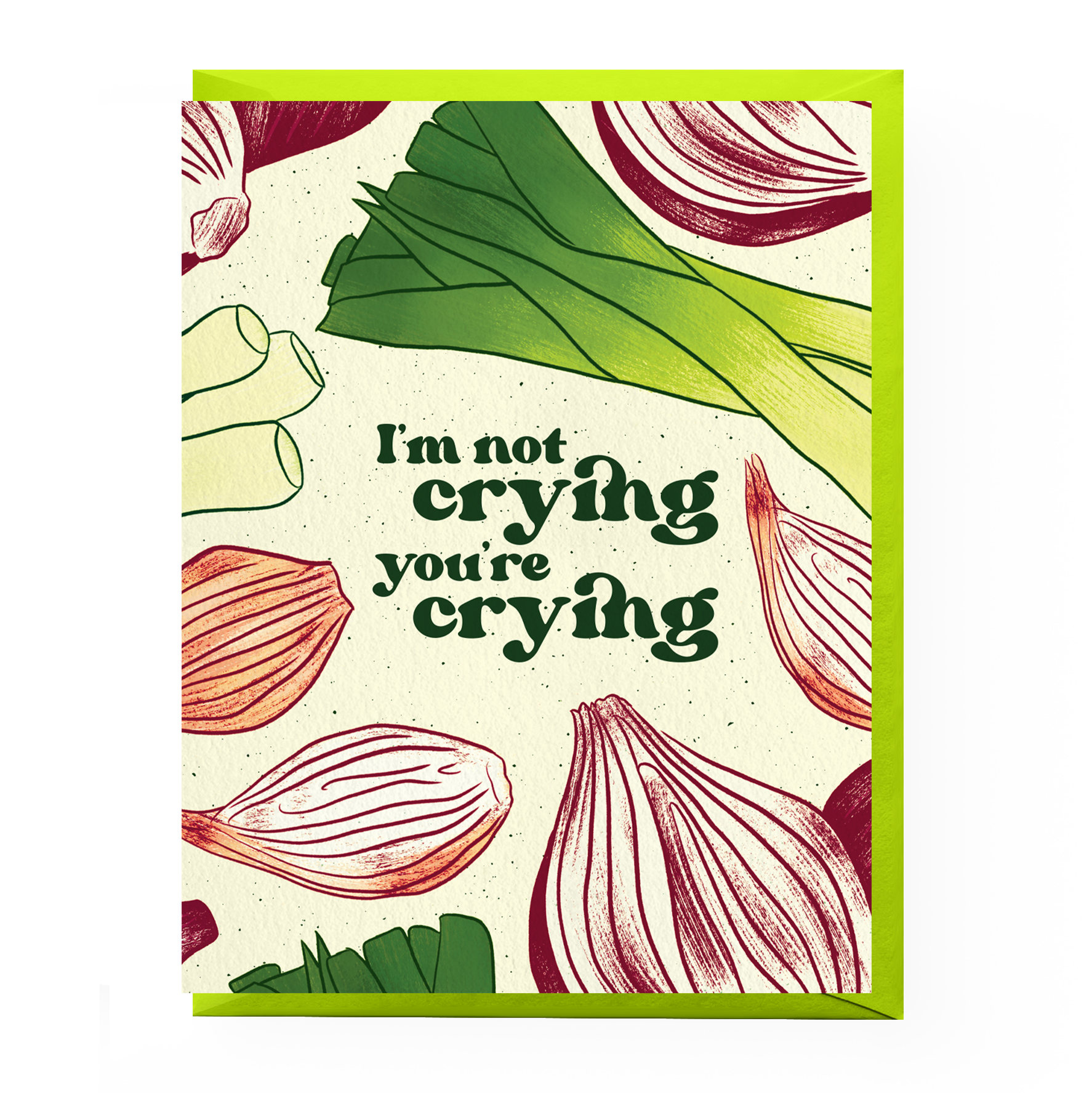 Send heartfelt congratulations for life's most tear-inducing milestones. Perfect for graduations, weddings, new babies and more! Printed on 100% recycled paper and paired with a coordinating envelope. Blank inside and sealed in a protective cellophane sleeve. Size A2 (4.25" x 5.5"). Card reads "I'm not crying, you're crying" and features illustrated leeks, onions and shallots in green, plum and peach. Boss Dotty Paper Co. -