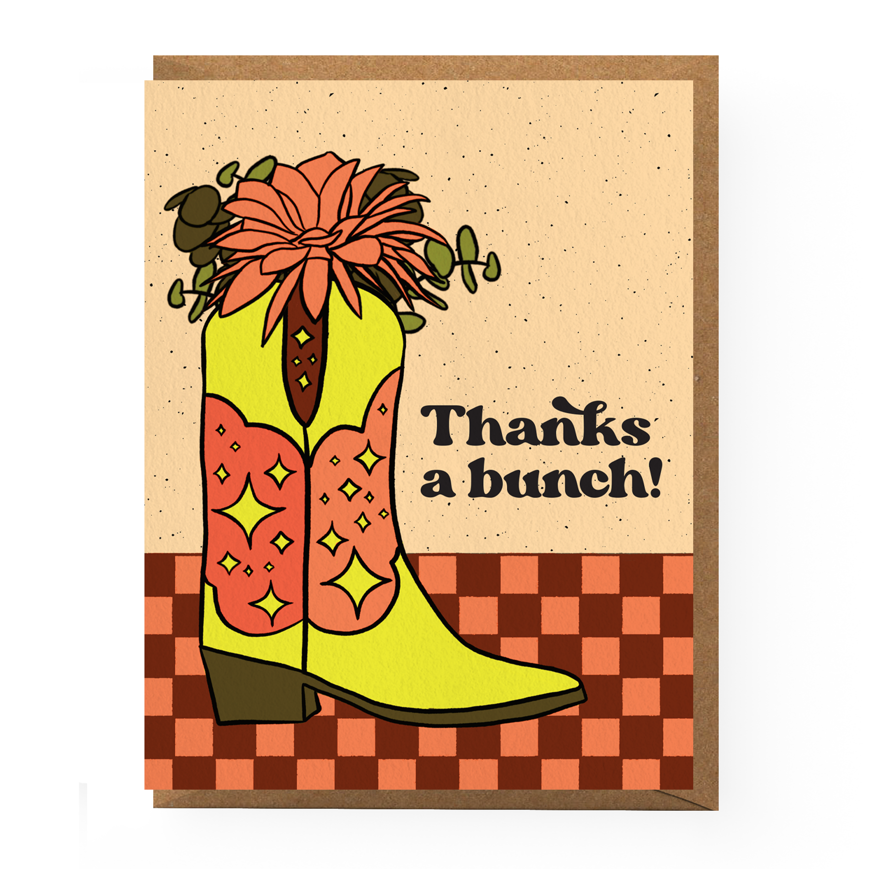 Express your gratitude with a sparkling cowboy boot bouquet. Printed on 100% recycled paper and paired with a coordinating envelope. Blank inside and sealed in a protective cellophane sleeve. Size A2 (4.25" x 5.5"). This Western thank you card reads "Thanks a bunch!" and features a cowboy boot filled with a bouquet in peach, bright yellow and brown. Boss Dotty Paper Co. -