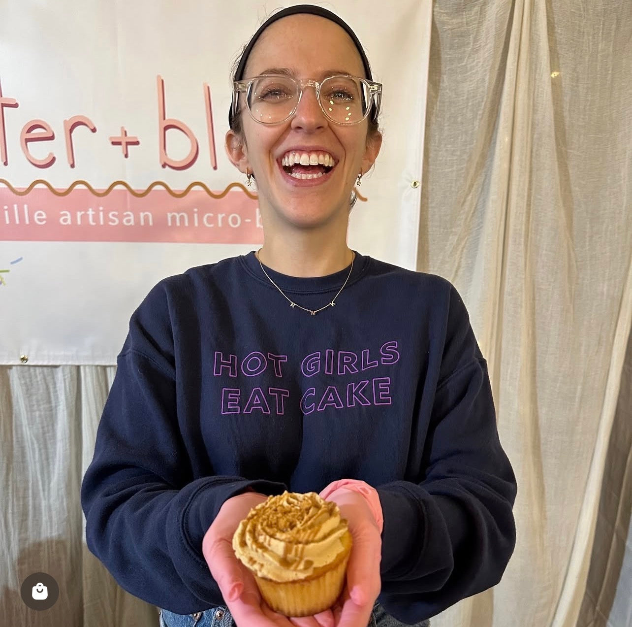 More about this slogan: this crewneck was originally released in 2021 as a limited edition collaboration with Rebecca Firth (aka @displacedhousewife) in celebration of her new cookbook, The Cake Book!