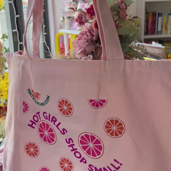 A fun, oversized tote to celebrate SMALL businesses!!! It has an interior zip pocket and a zip top for ideal shopping days. It comes in a light pink color with multicolored graphic.