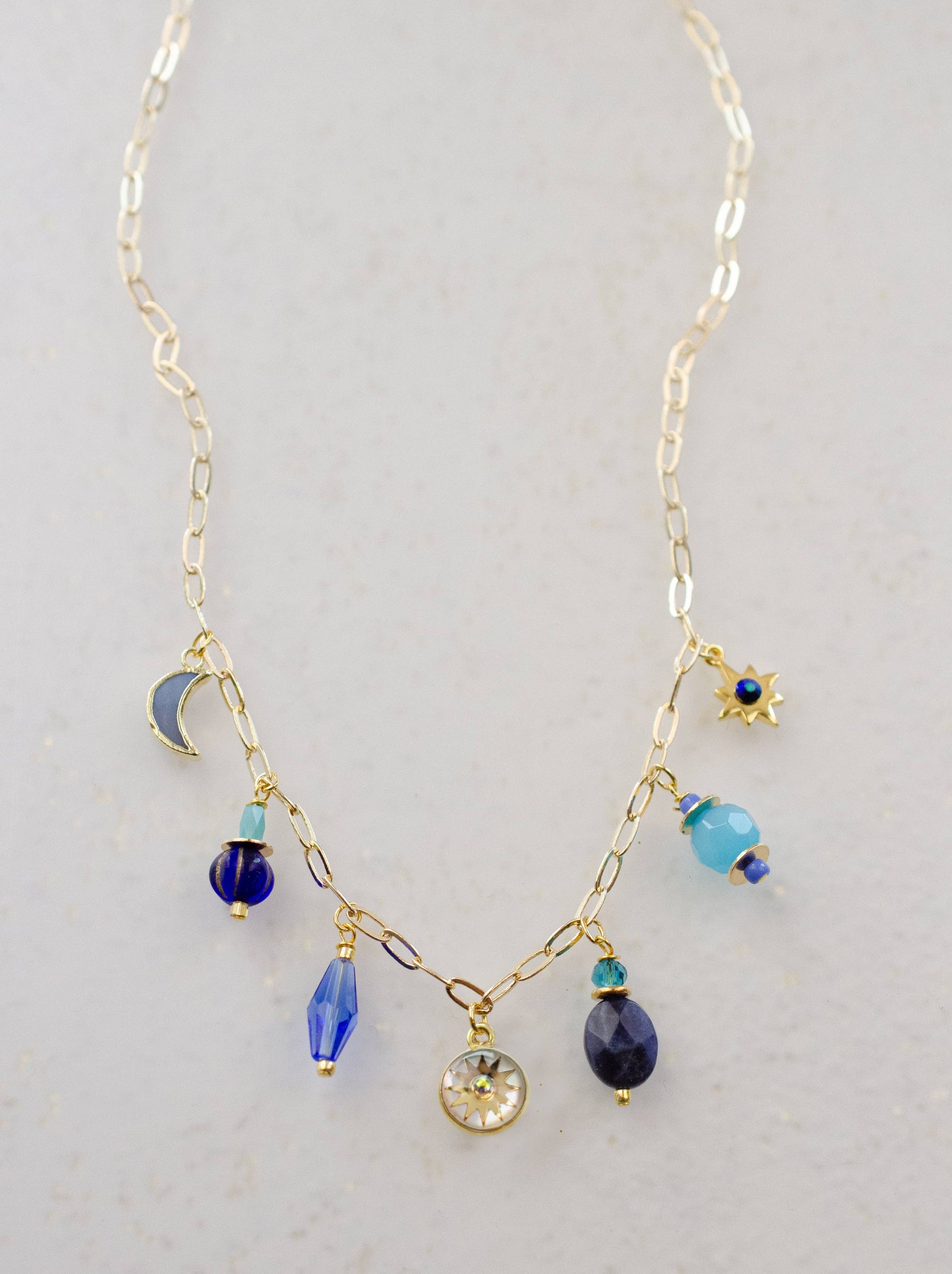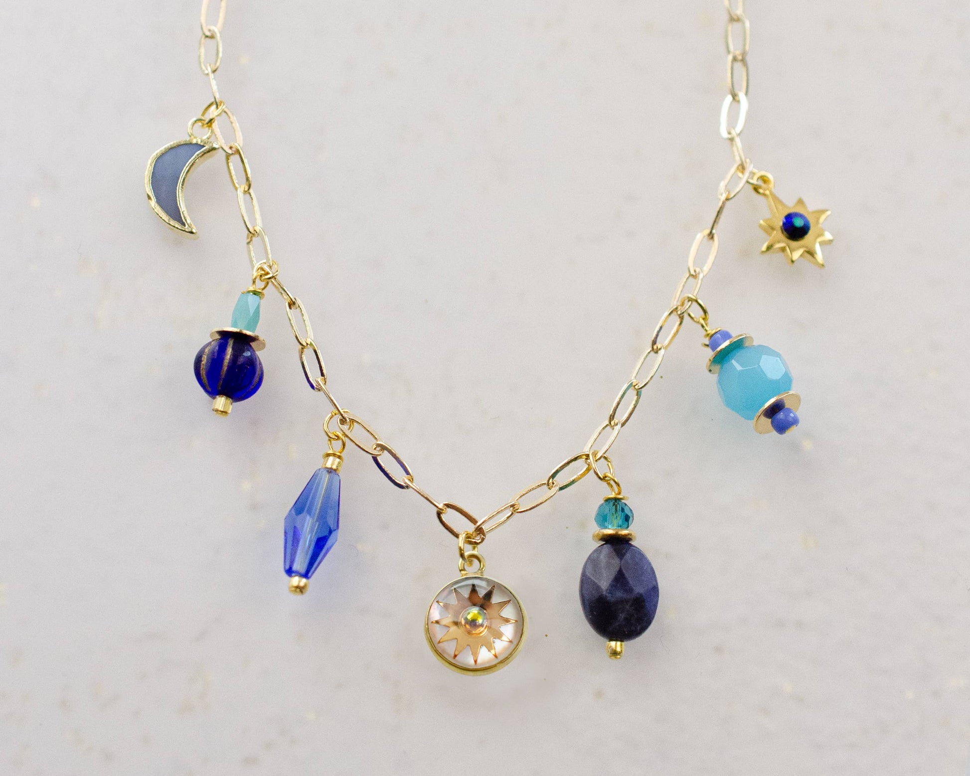 Celebrate your zodiac sign with our handmade Zodiac Charm Necklace, designed for Water signs (Cancer, Scorpio, Pisces). Featuring a delicate blend of Czech glass beads, natural stones, and a blue opal moon charm, this accessory complements your intuitive nature.