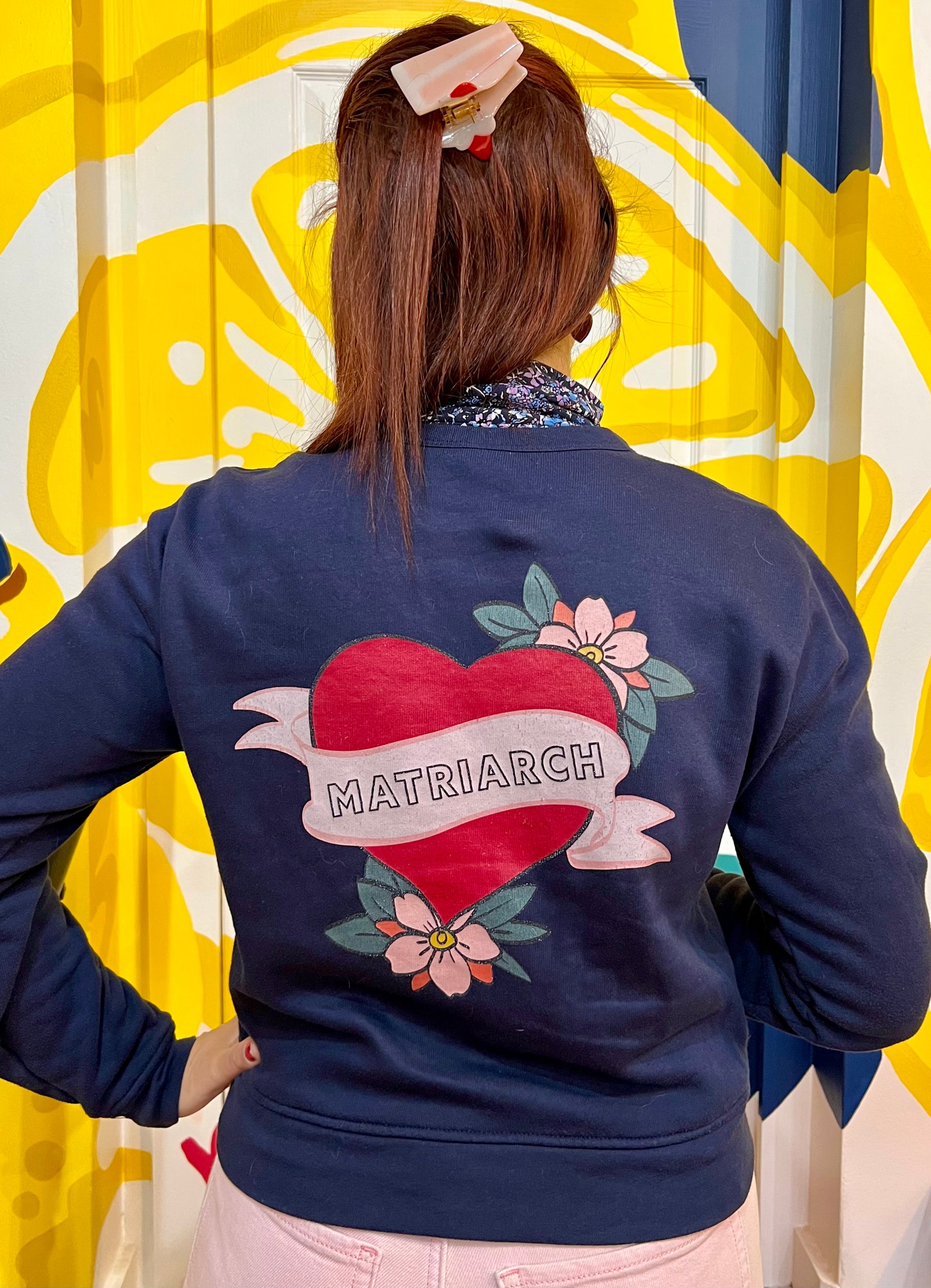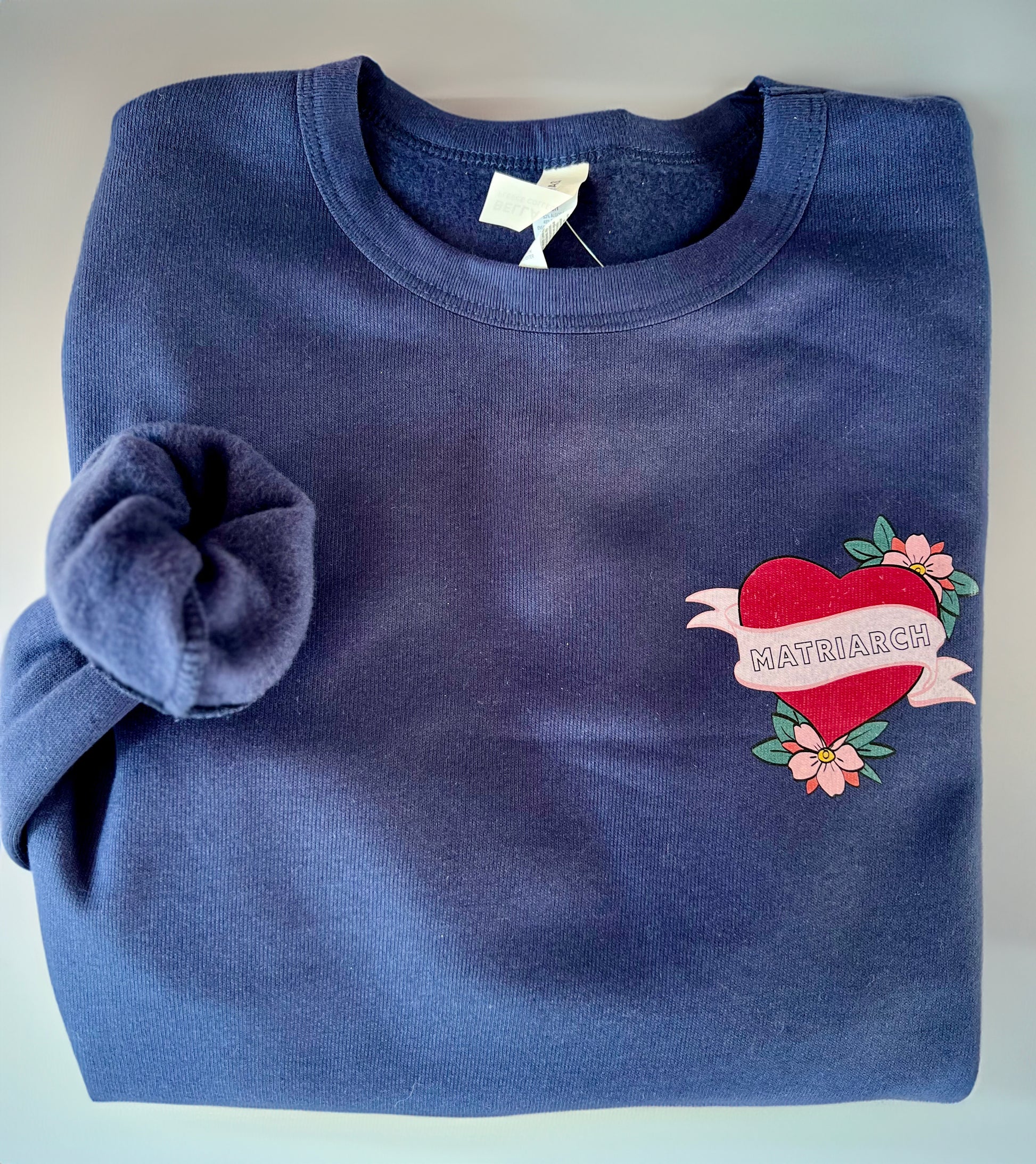 Pay tribute to your matriarchs with this Matriarch mom tattoo design. This navy women's cut sweatshirt features a front and back full color graphic.