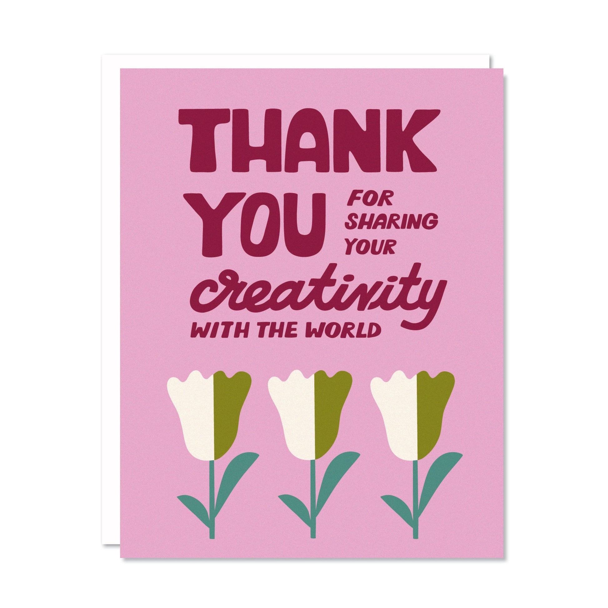 "Thank you for sharing your creativity with the world" Digitally printed, A2 size card (4.25" x 5.5"), matching envelope. Each card is blank inside and comes in a protective cello sleeve. Designed by Odd Daughter, made in the USA, and shipped from Albuquerque, NM. substituted.
