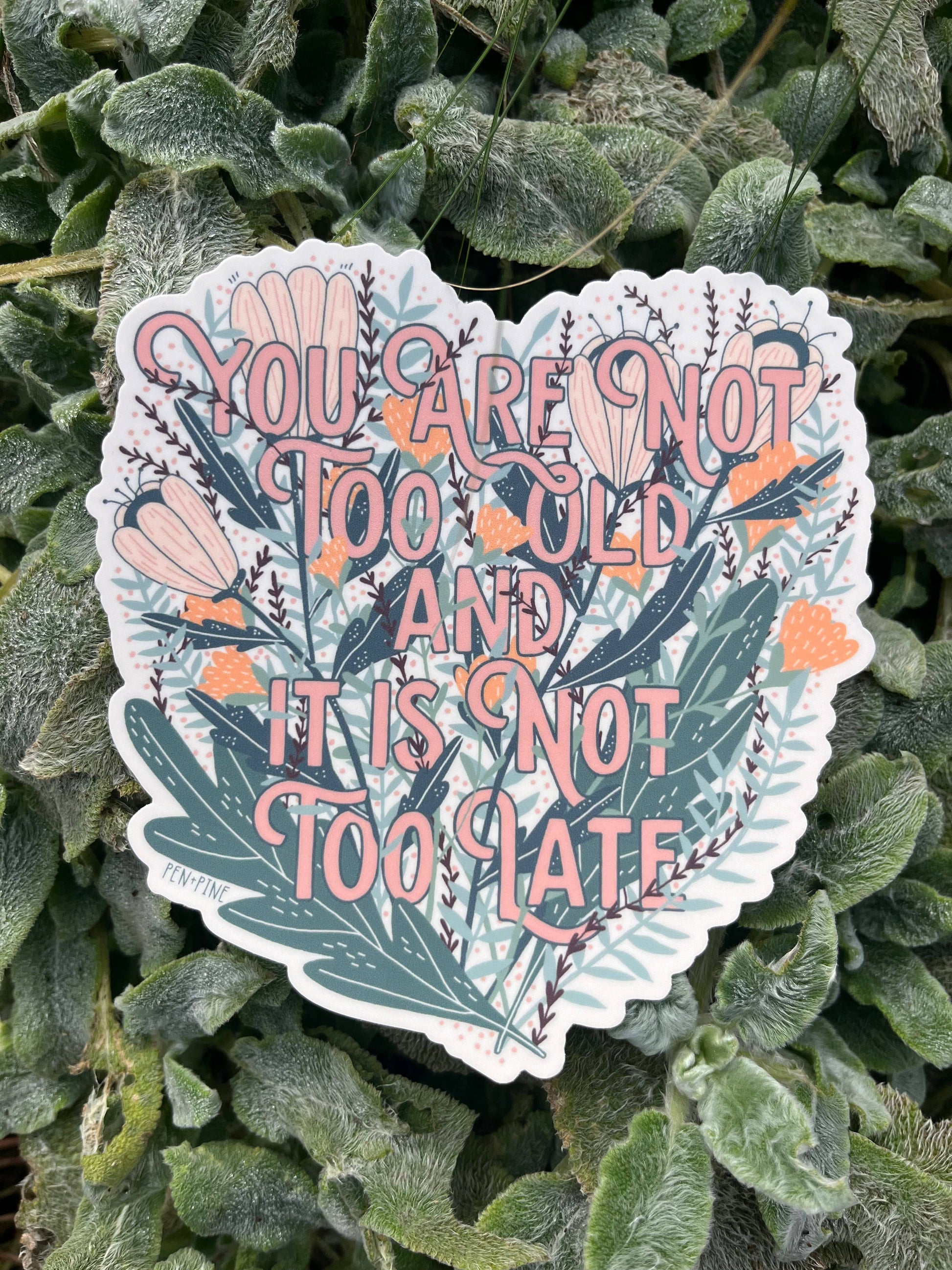 You are not too old, and it's not too late! The perfect sticker to remind you that you have plenty of time to pursue your dreams. This sticker features a flowers and plants wrapping around the words "You are not too old and it is not too late". This is a great message to stick to your bumper and share with the world, or stick to your laptop or water bottle to remind yourself.