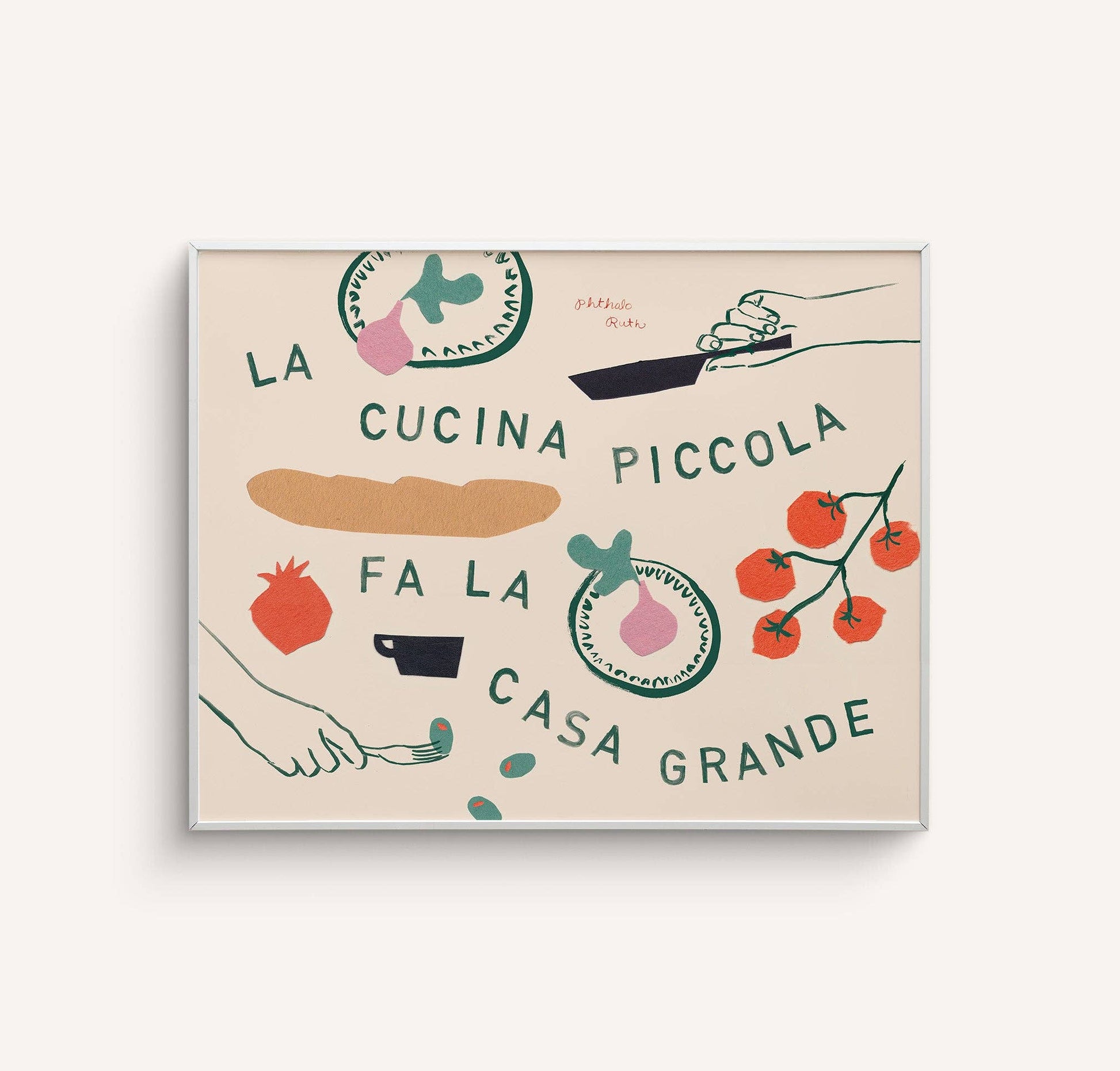 A Small Kitchen Makes a Big Home Art Print celebrates the warmth and joy that come from sharing a meal. This hand-painted artwork features a charming scene of hands sharing food, playfully surrounded by fresh bread, tomatoes, and the Italian phrase "La Cucina Piccola Fa La Casa Grande" (The Small Kitchen Makes the Big Home), Reminding us of memories shared over good food. Phthalo Ruth -