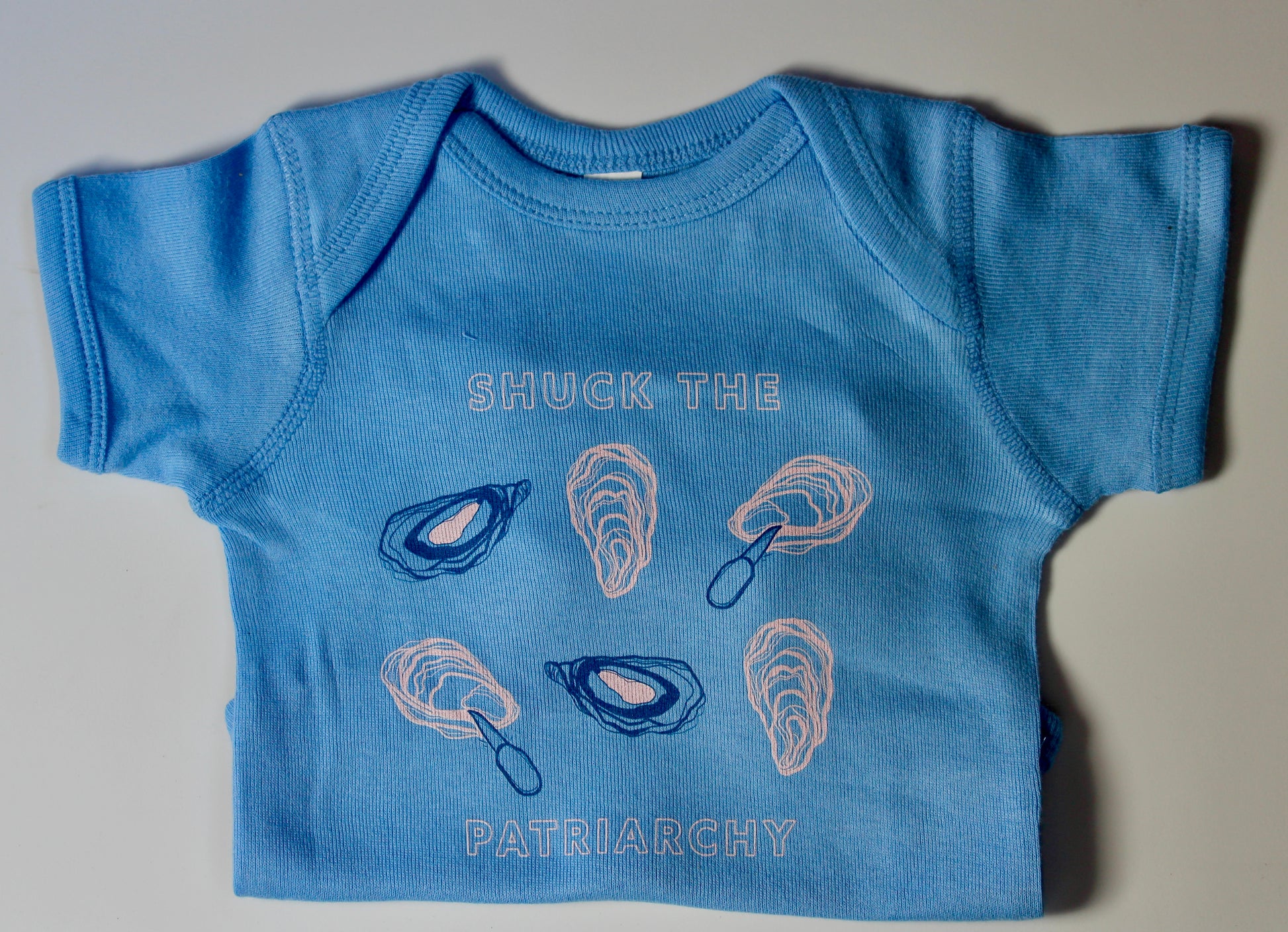 Empowerment starts young in this baby onesie. Oyster loving parents will go wild for the Shuck the Patriarchy Baby Onesie. It comes in 5 infant sizes in hydrangea blue with multicolored graphic and matches the adult version of the tee identically.