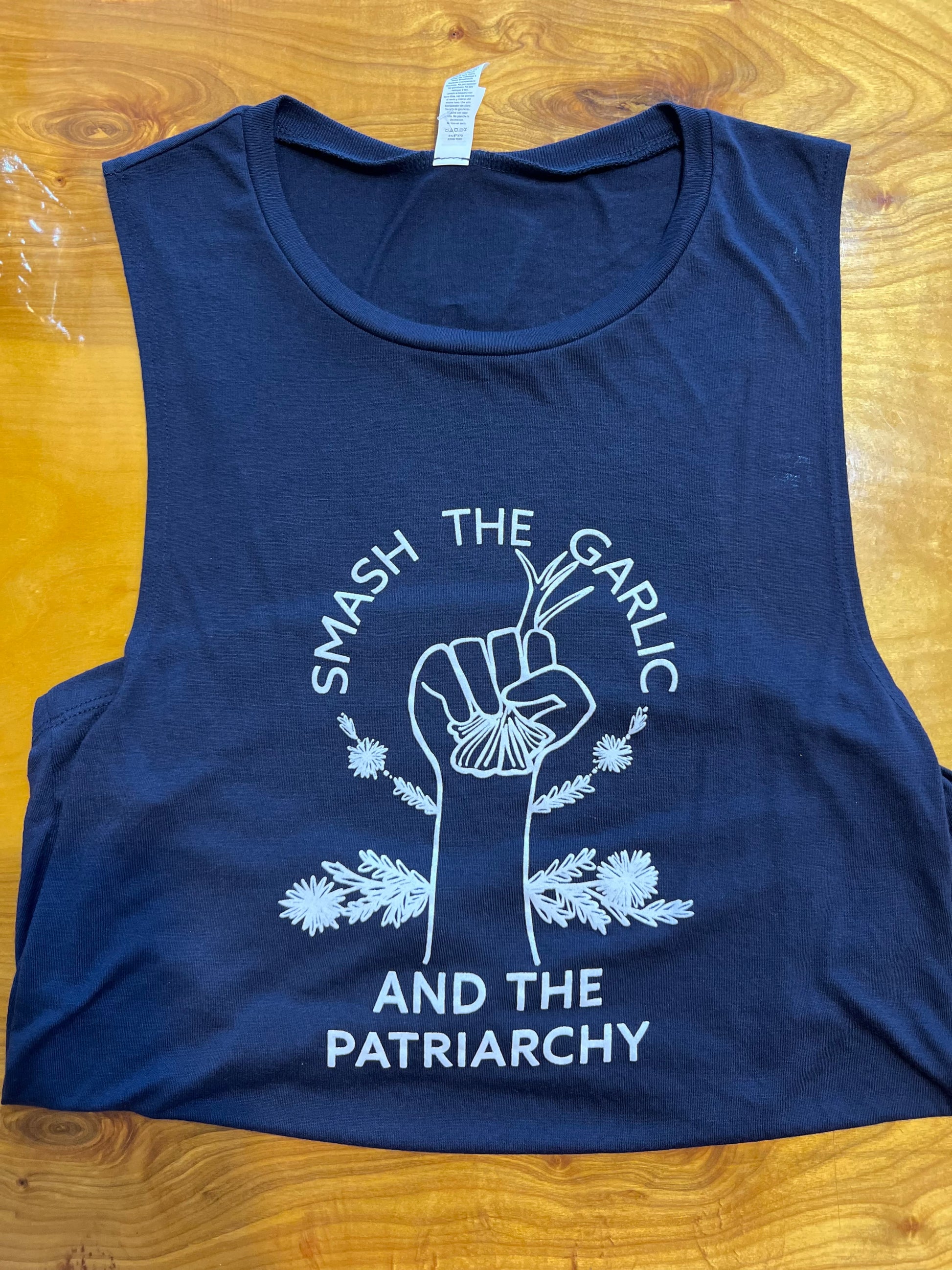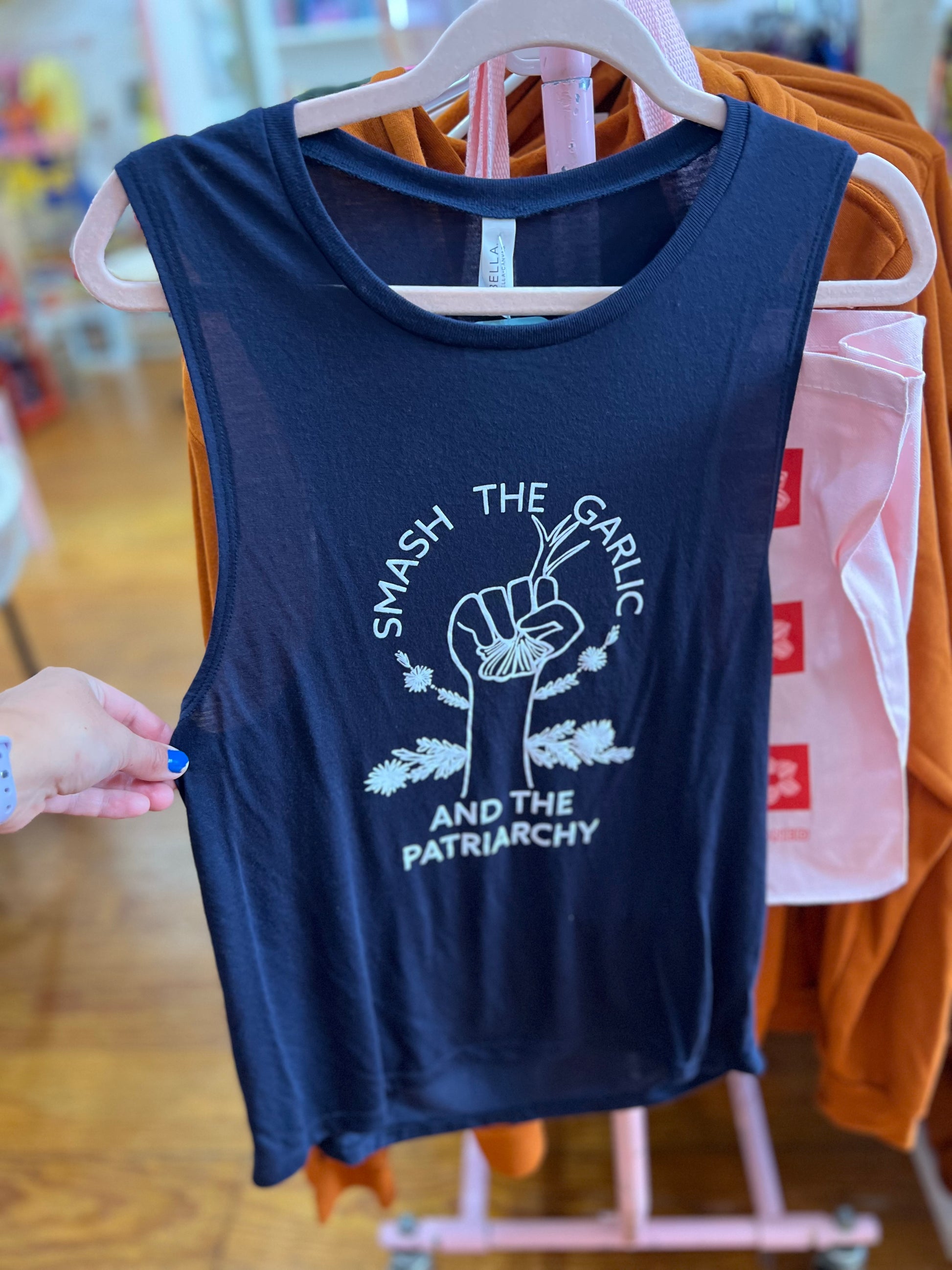 The Smash the Garlic and the Patriarchy tank top is super comfy, bold and radical. This navy tank comes in women's sizes and has a drapey fit. It also contributes to a great cause with 15% of each sale going to Planned Parenthood.